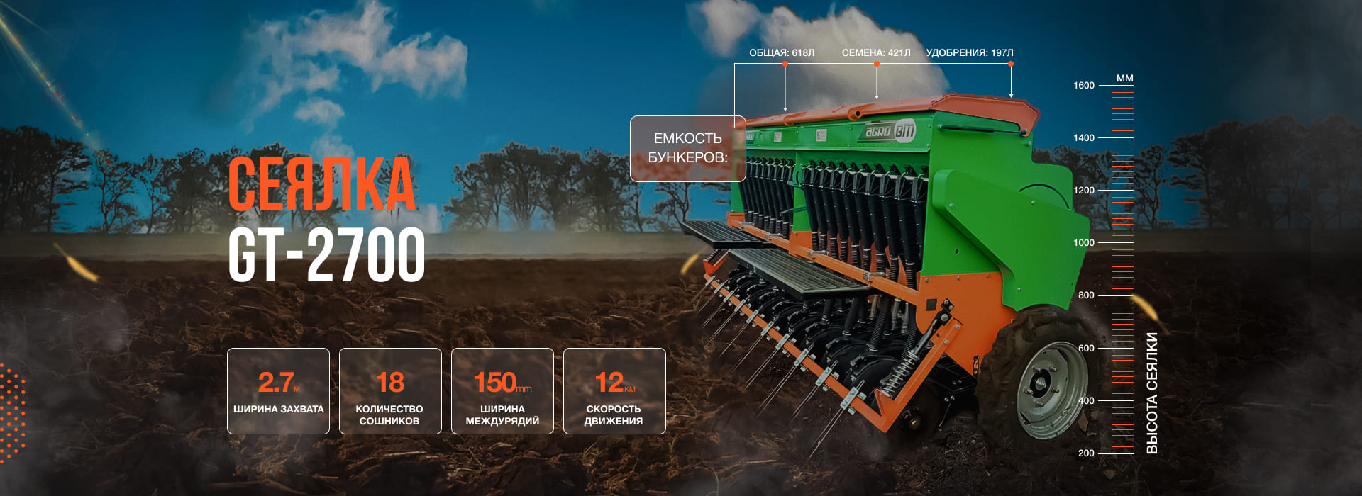 Навесная зерновая сеялка GT‑2700 — идеальное решение для точного посева и внесения удобрений. Получи доставку прямо в хозяйство и заводскую гарантию. Введем сеялку в эксплуатацию, настроим норму высева нужную вам и покажем как ее легко регулировать. Украинский производитель сельхоз техники AGROBM - это гарантия качества и отличные сервис.